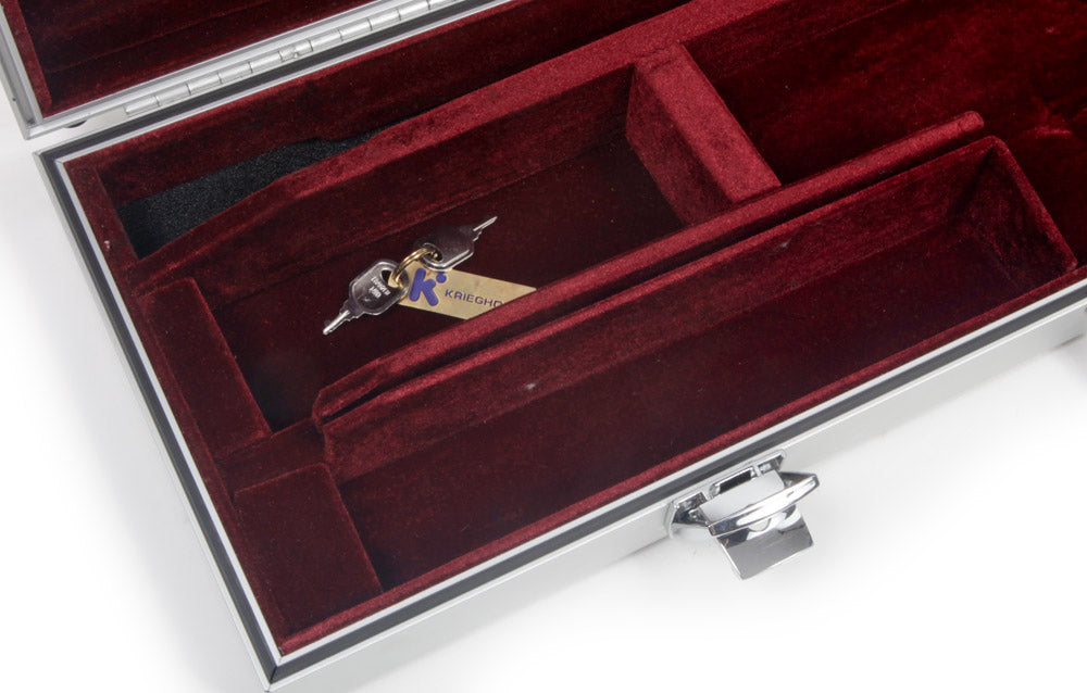 The case is an ex-demo case but is in very good condition. It has a combination lock and two further lockable catch locks either side. The case is lined with red velvet like material to keep the contents secure and protected from scratches. This particular case has K-20 embroidered on the inside of the lid in gold. The case has some marks on the outside, but generally in very good condition throughout.