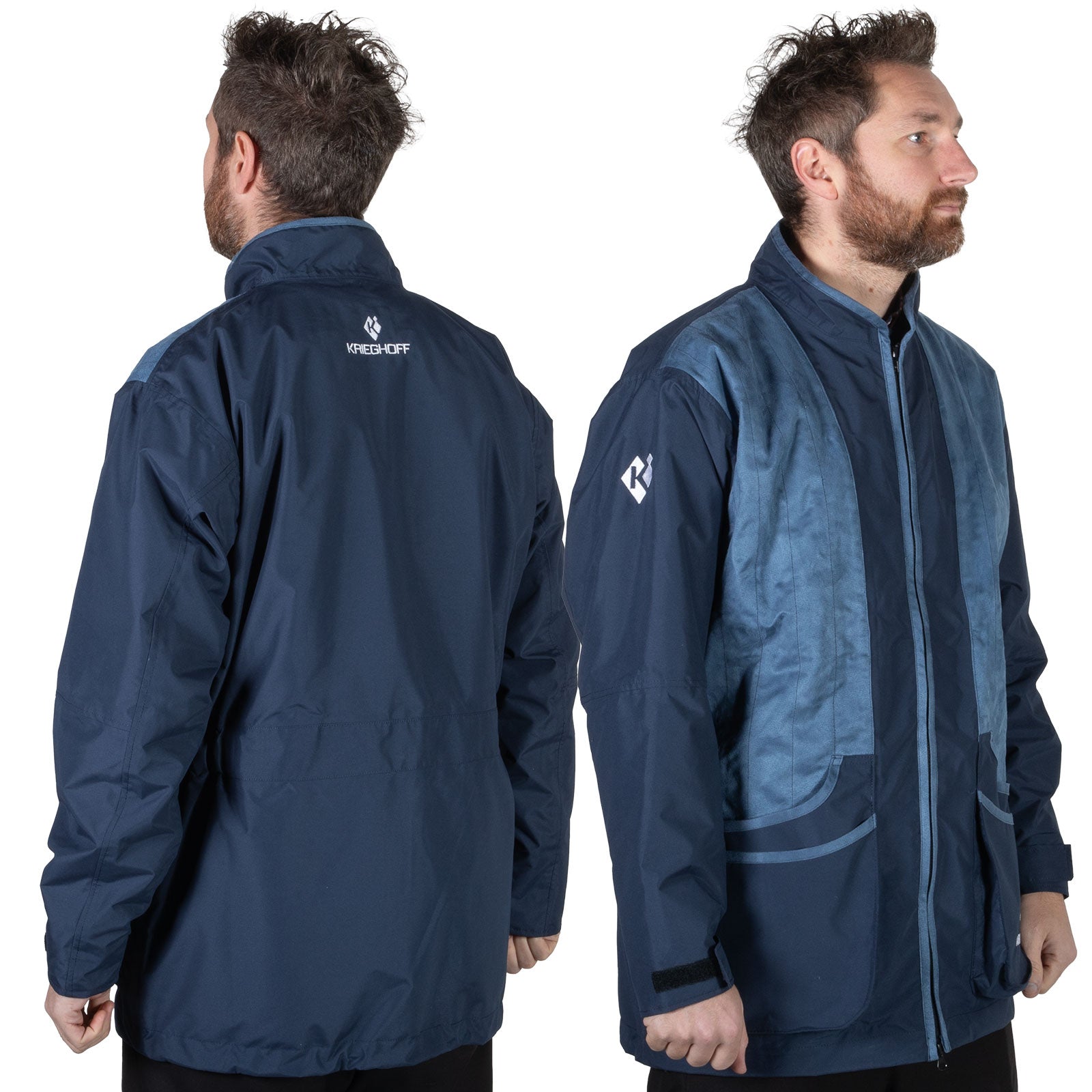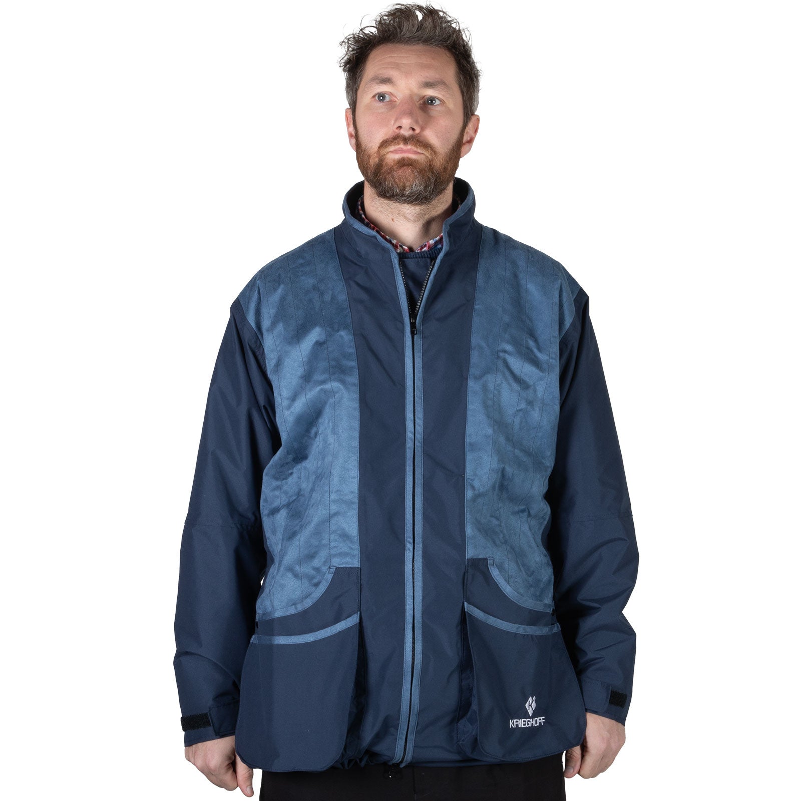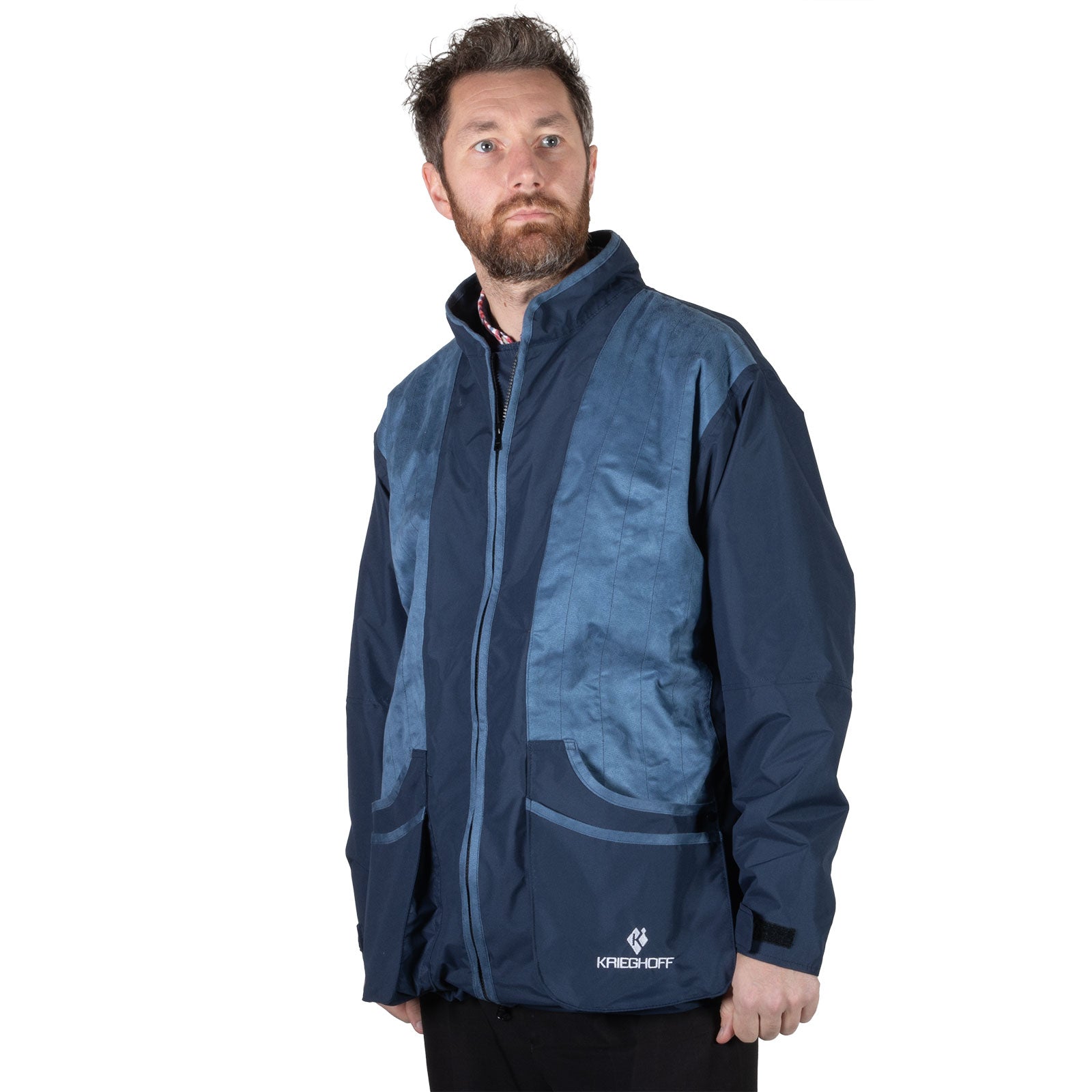Featuring a weather resistant outer shell material reflects the majority of the rain and wind, a mesh lining keeps the jacket well ventilated too. The Velcro cuffs can be tightened up as you please to prevent rain or wind going up your sleeve when mounting your gun and keep them clear of your gun when shooting. The jacket features two large double shell pocket which will hold more than enough cartridges. The faux suede shooting patches in pale blue on the left and right side runs the entire length up from the pocket to your shoulder, to protect the jacket from wear when mounting.