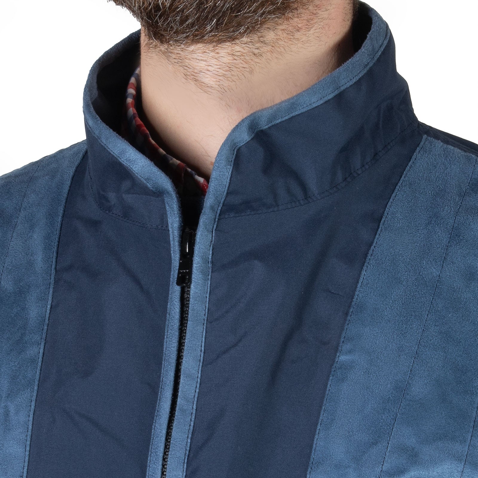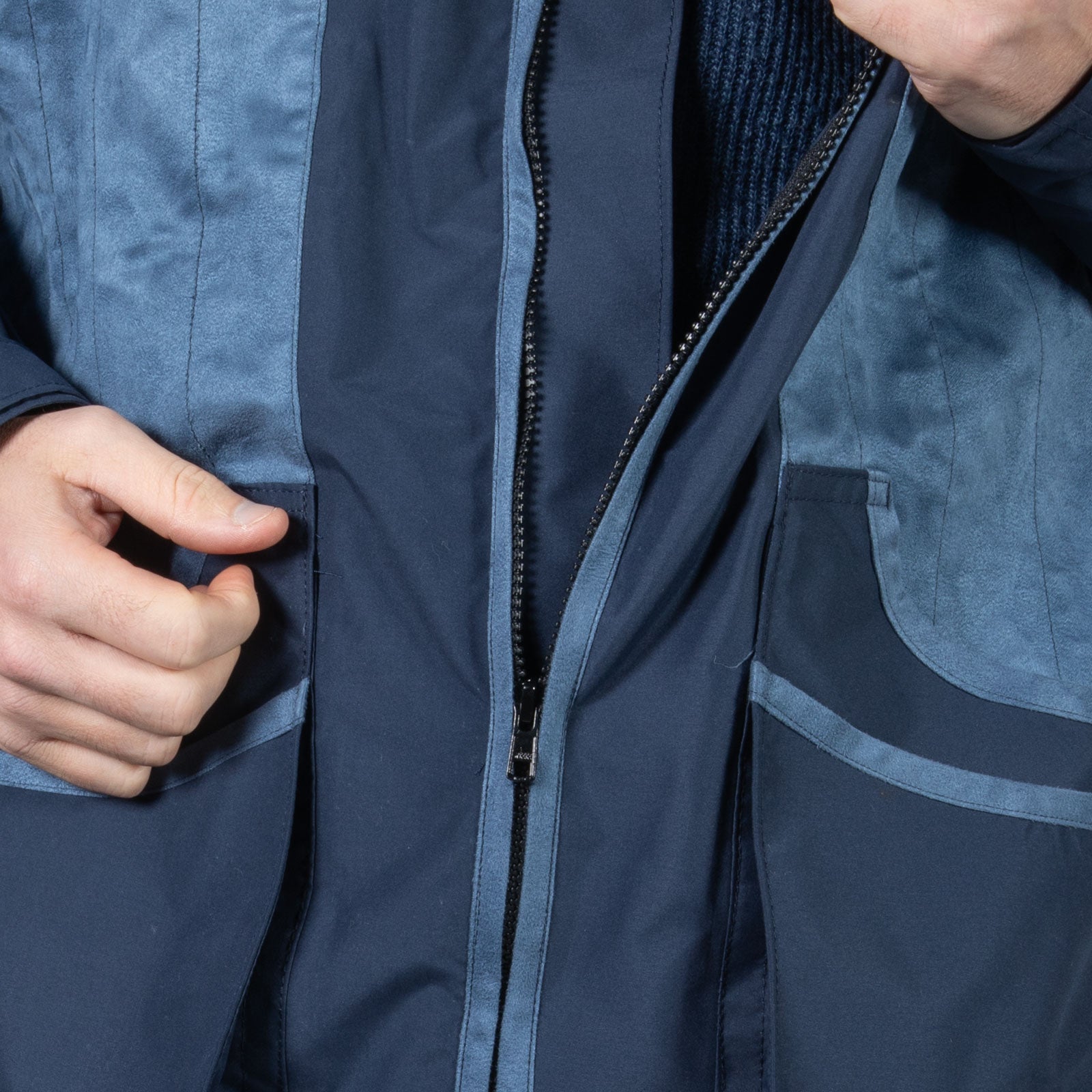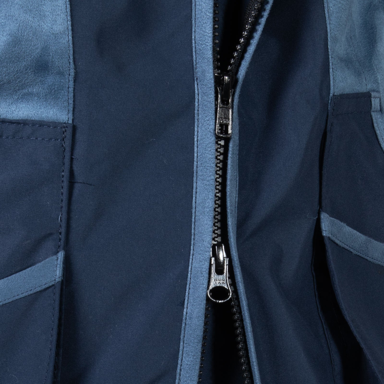 Featuring a weather resistant outer shell material reflects the majority of the rain and wind, a mesh lining keeps the jacket well ventilated too. The Velcro cuffs can be tightened up as you please to prevent rain or wind going up your sleeve when mounting your gun and keep them clear of your gun when shooting. The jacket features two large double shell pocket which will hold more than enough cartridges. The faux suede shooting patches in pale blue on the left and right side runs the entire length up from the pocket to your shoulder, to protect the jacket from wear when mounting.