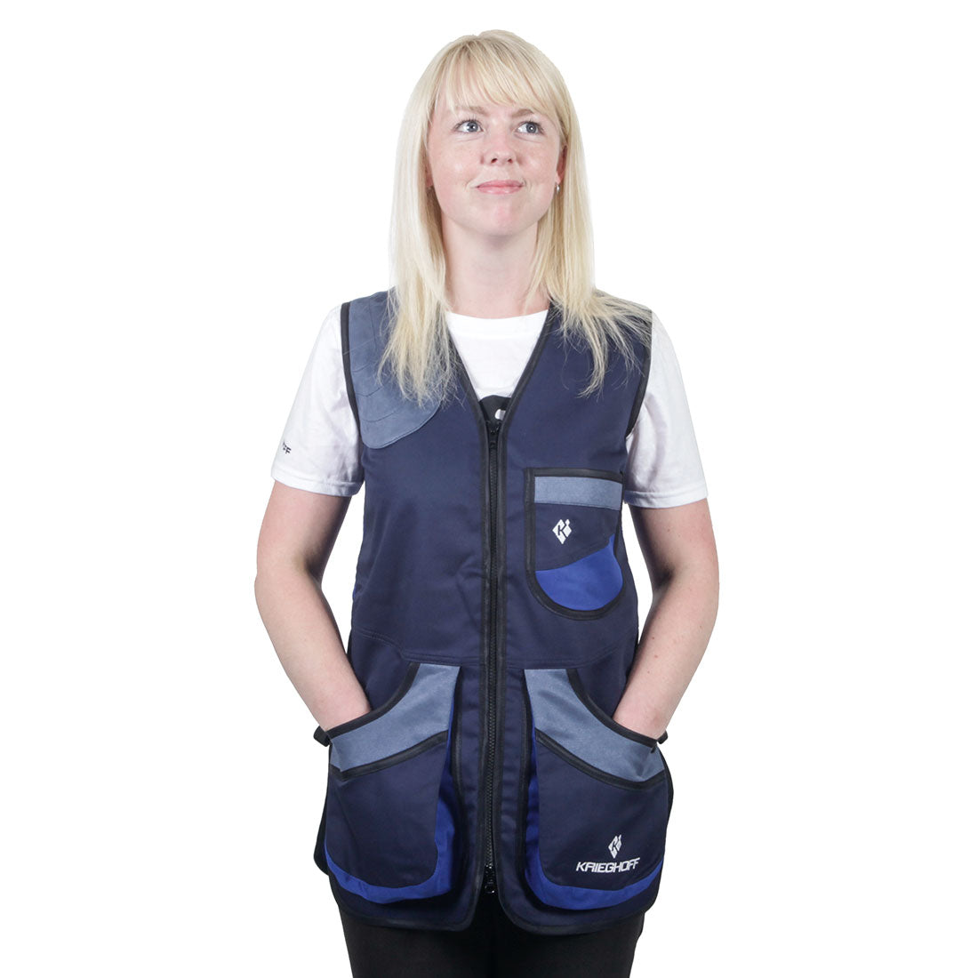 The new Krieghoff Ladies Shooting Vest has been designed for lady shooters. Comfortable, lightweight, practical and stylish. The vest has an elasticated waist to ensure a comfortable yet fitted feel and look. The subtle light blue faux suede detailing on the pockets and shoulder patch work well with the contrasting royal blue & navy colour scheme, to give this vest a unique look for the Krieghoff brand.