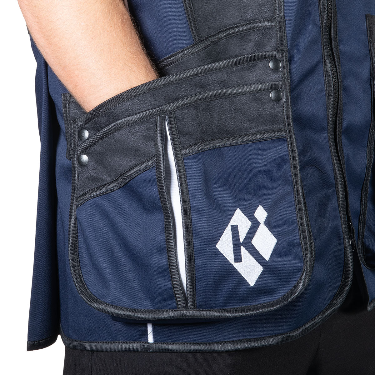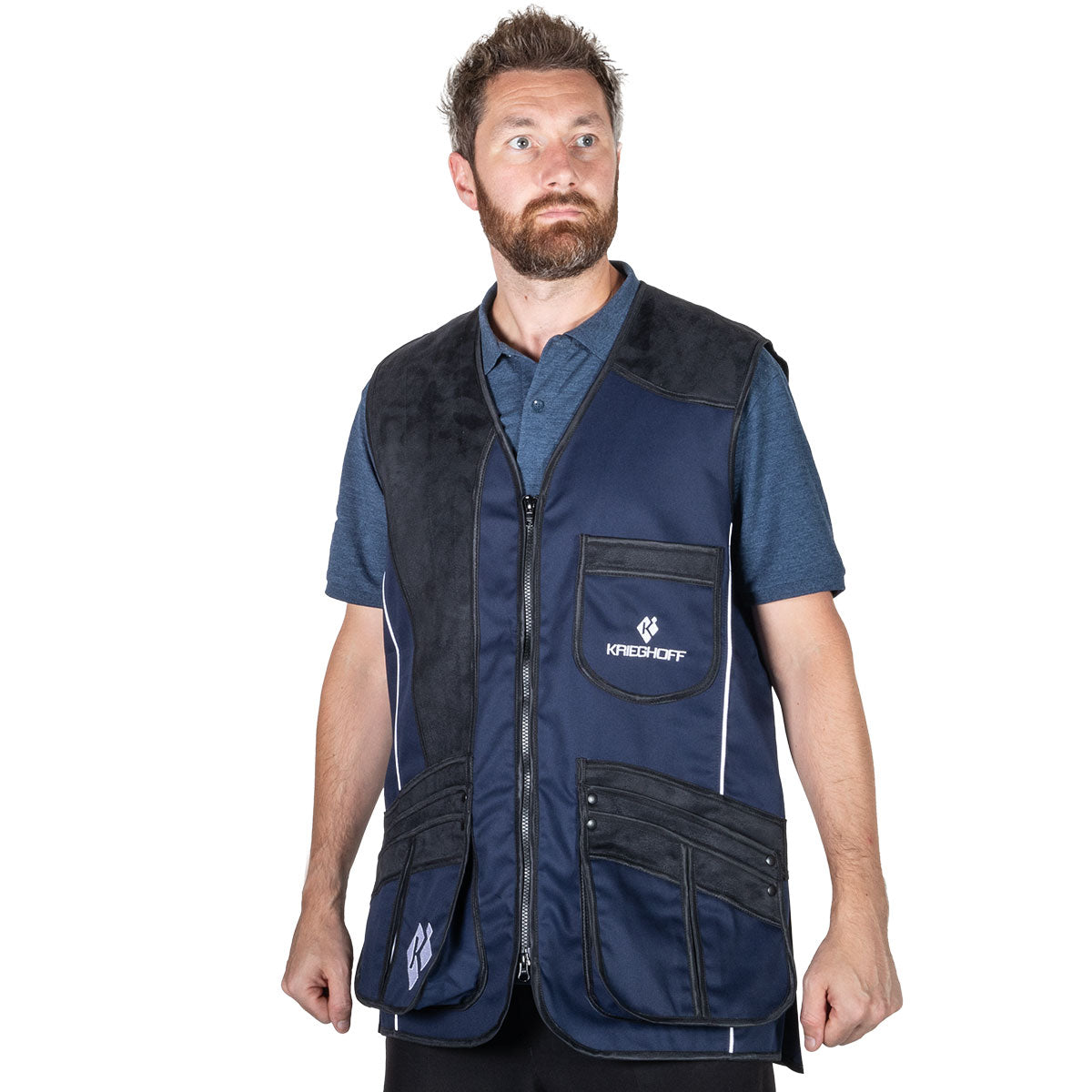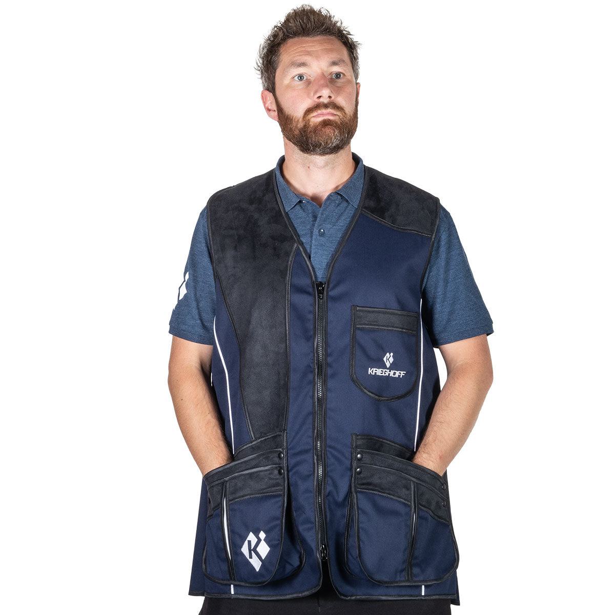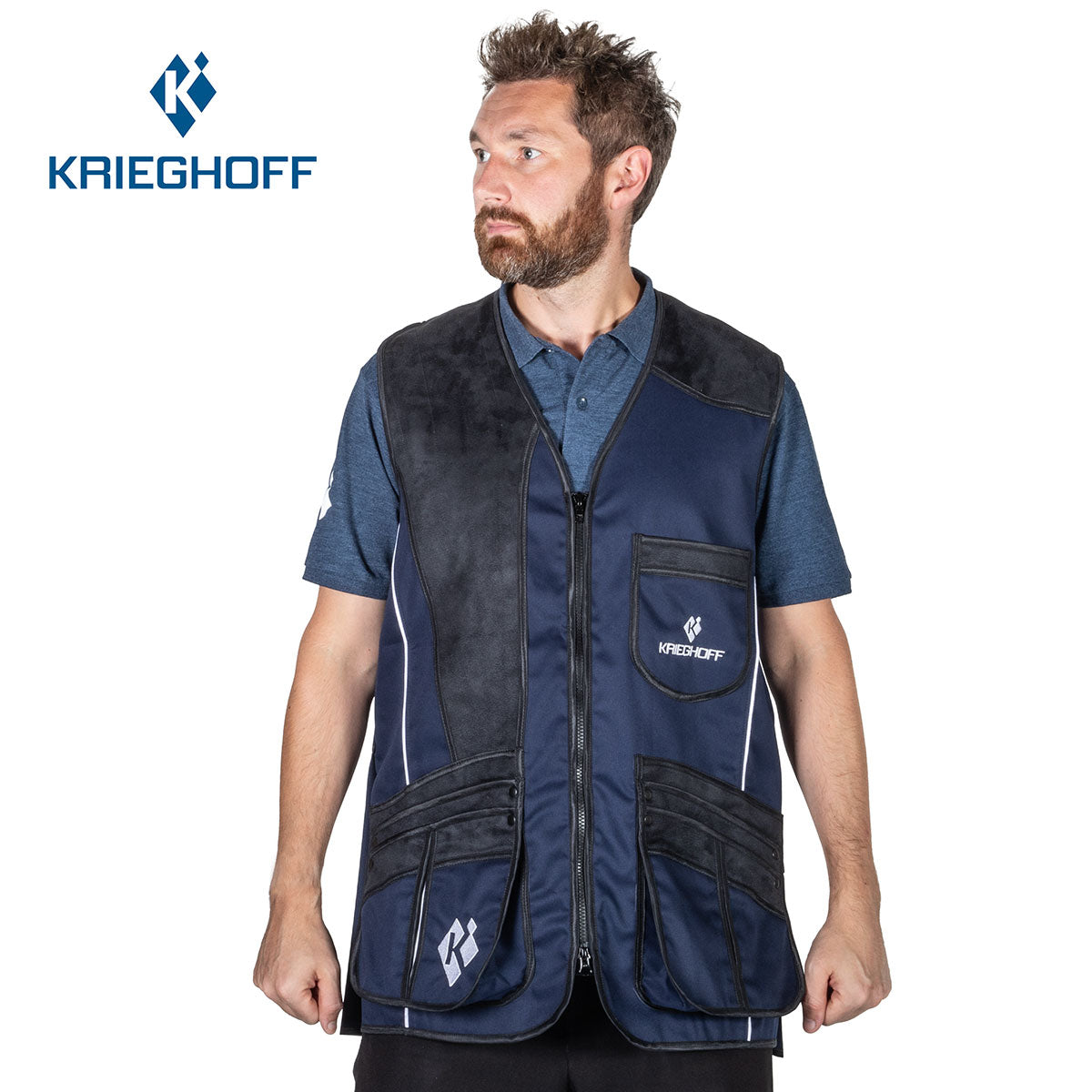 The Krieghoff Logos in white on the left chest pocket, the right shell pocket and the rear nape of the neck stand out against the dark navy and black colours running throughout the vest. There are also contrasting white piping detailing and white inner detail on the pocket bellow too.