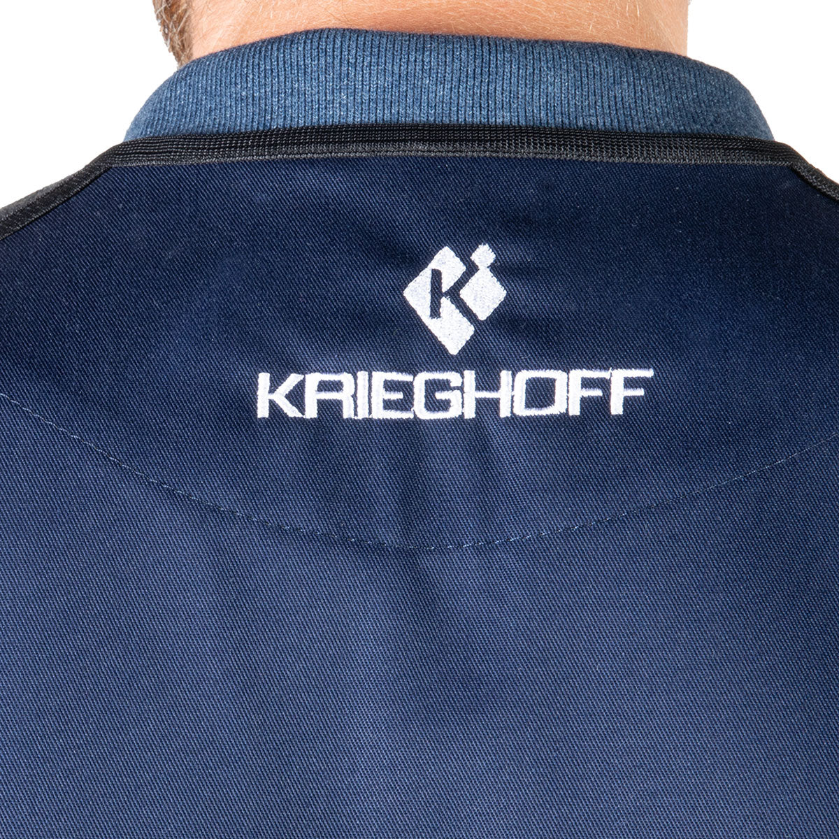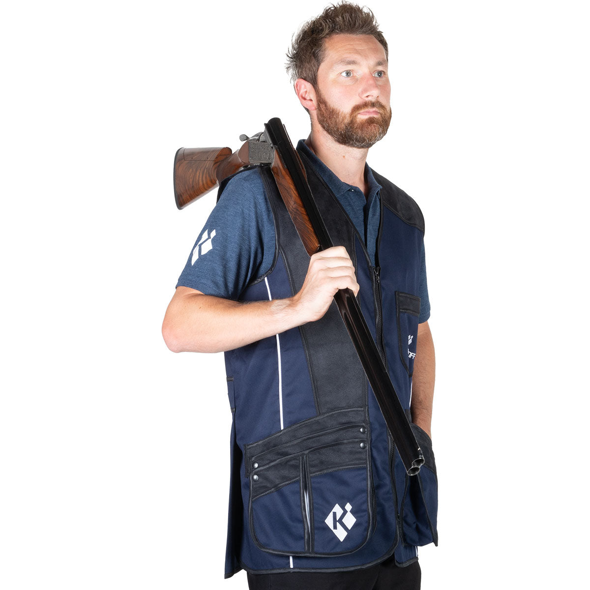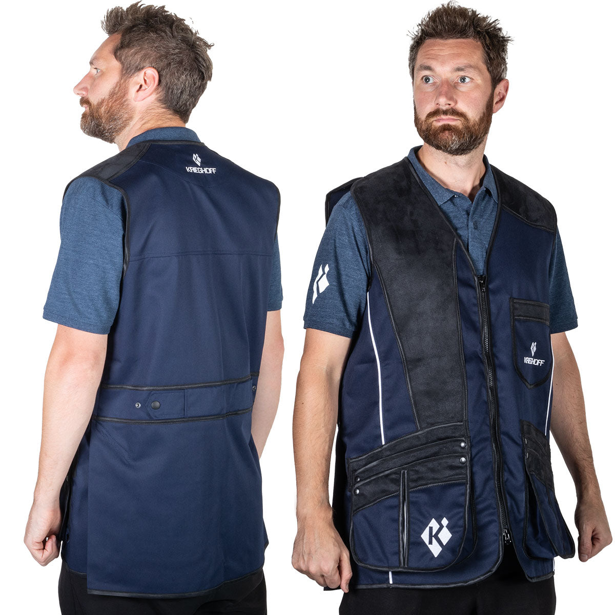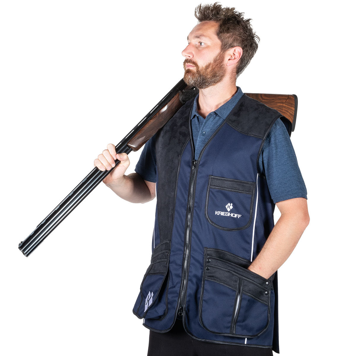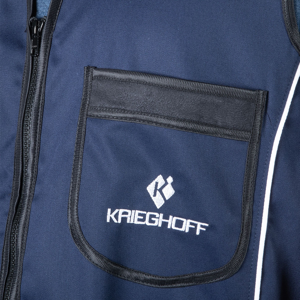 The Krieghoff Logos in white on the left chest pocket, the right shell pocket and the rear nape of the neck stand out against the dark navy and black colours running throughout the vest. There are also contrasting white piping detailing and white inner detail on the pocket bellow too.