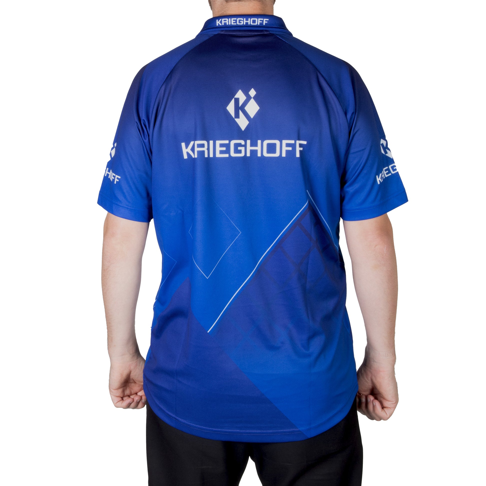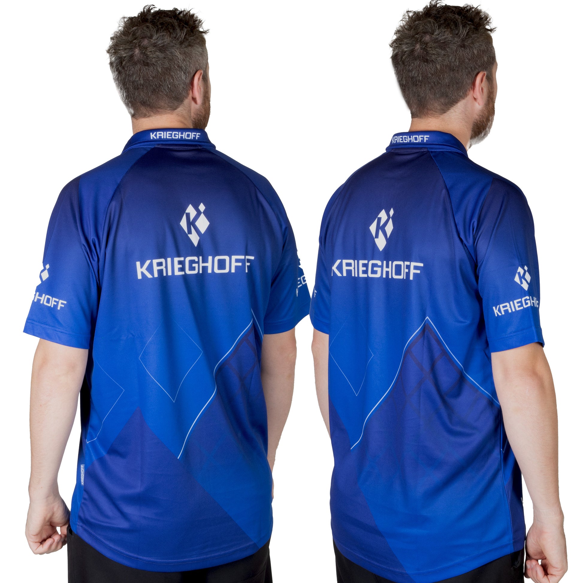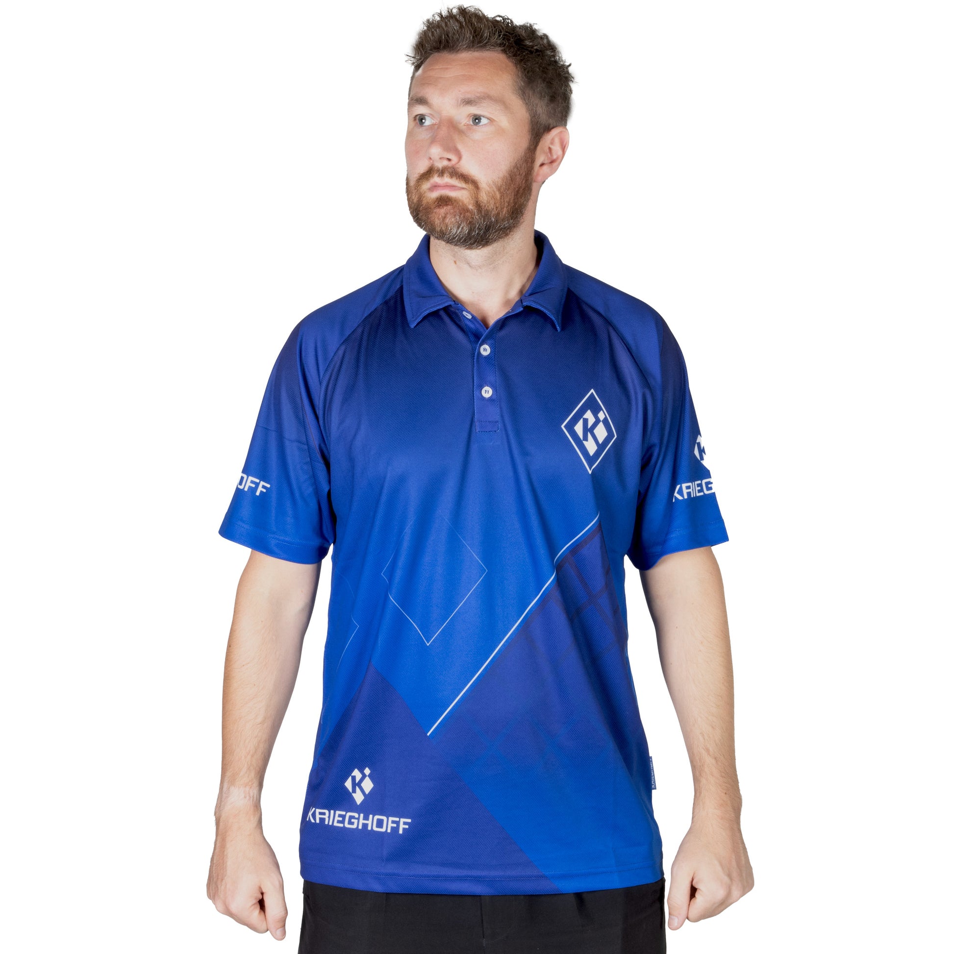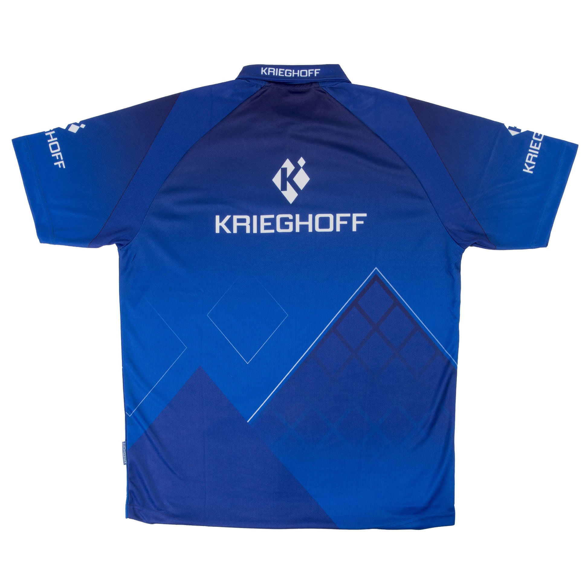 This is a polo-shirt designed specifically for Krieghoff. The royal and navy colours incorporate subtle diamond patterns throughout, with dark to light blue tones graduating from top to bottom. On the front in bold white contrasting colours, the Krieghoff Diamond logo on the left chest and the full Krieghoff Logo on the lower right. Featuring full Krieghoff Logos on the right and left sleeves and also across the shoulders on the back. Krieghoff also features on the rear of the collar and on the stitched side tag.