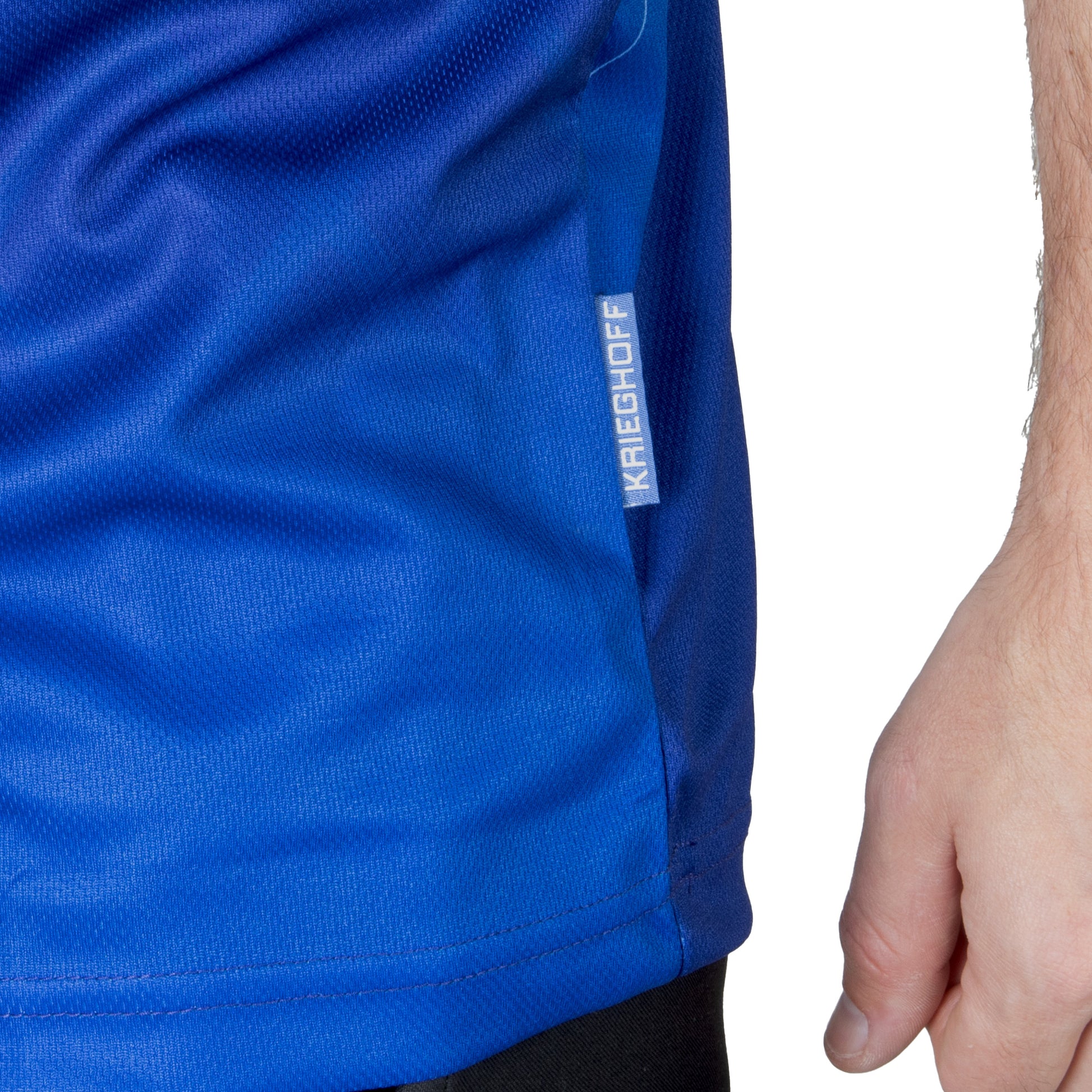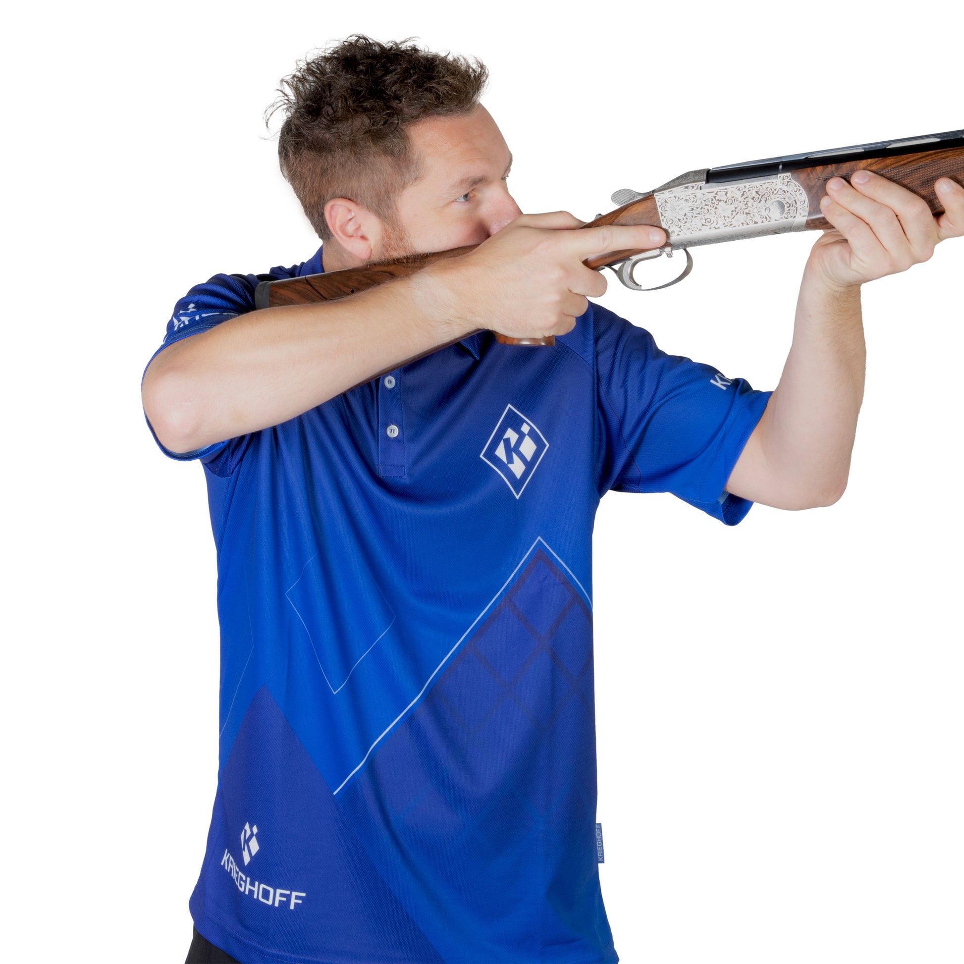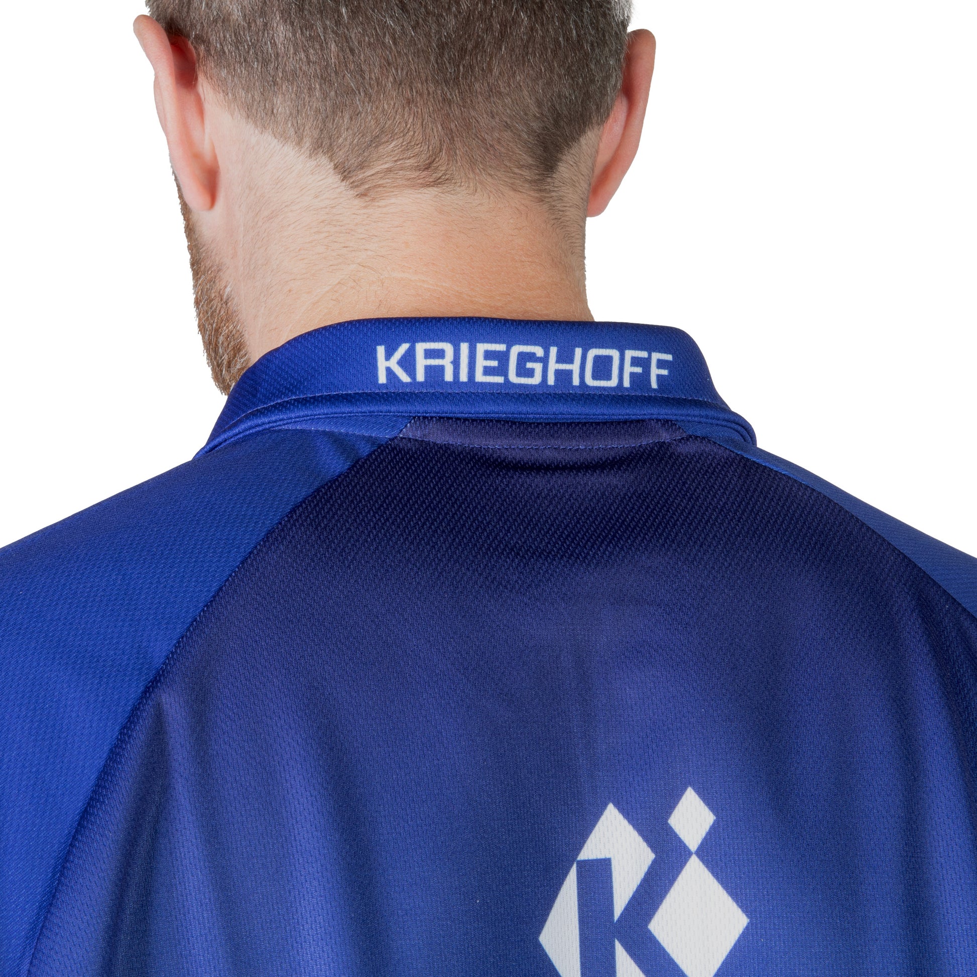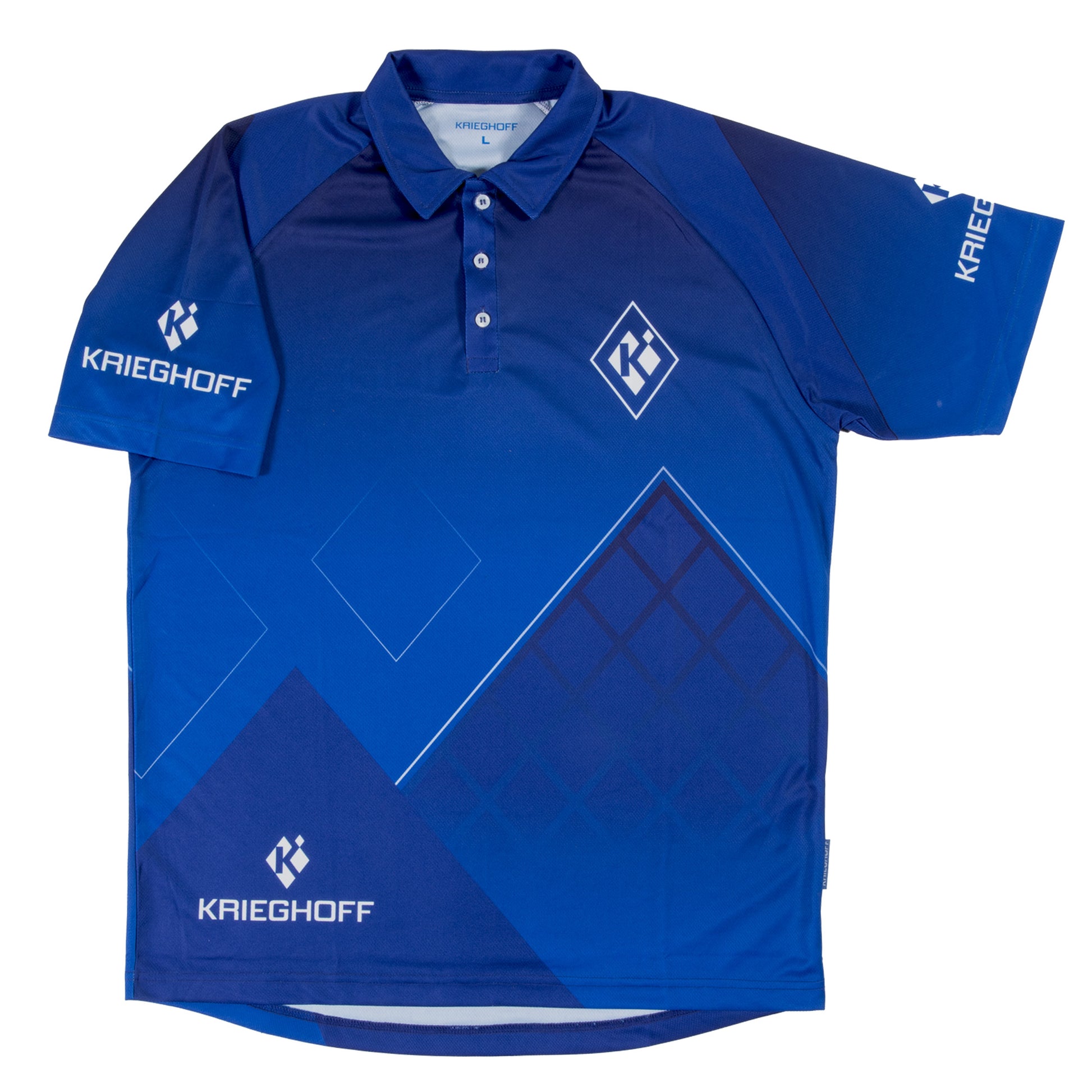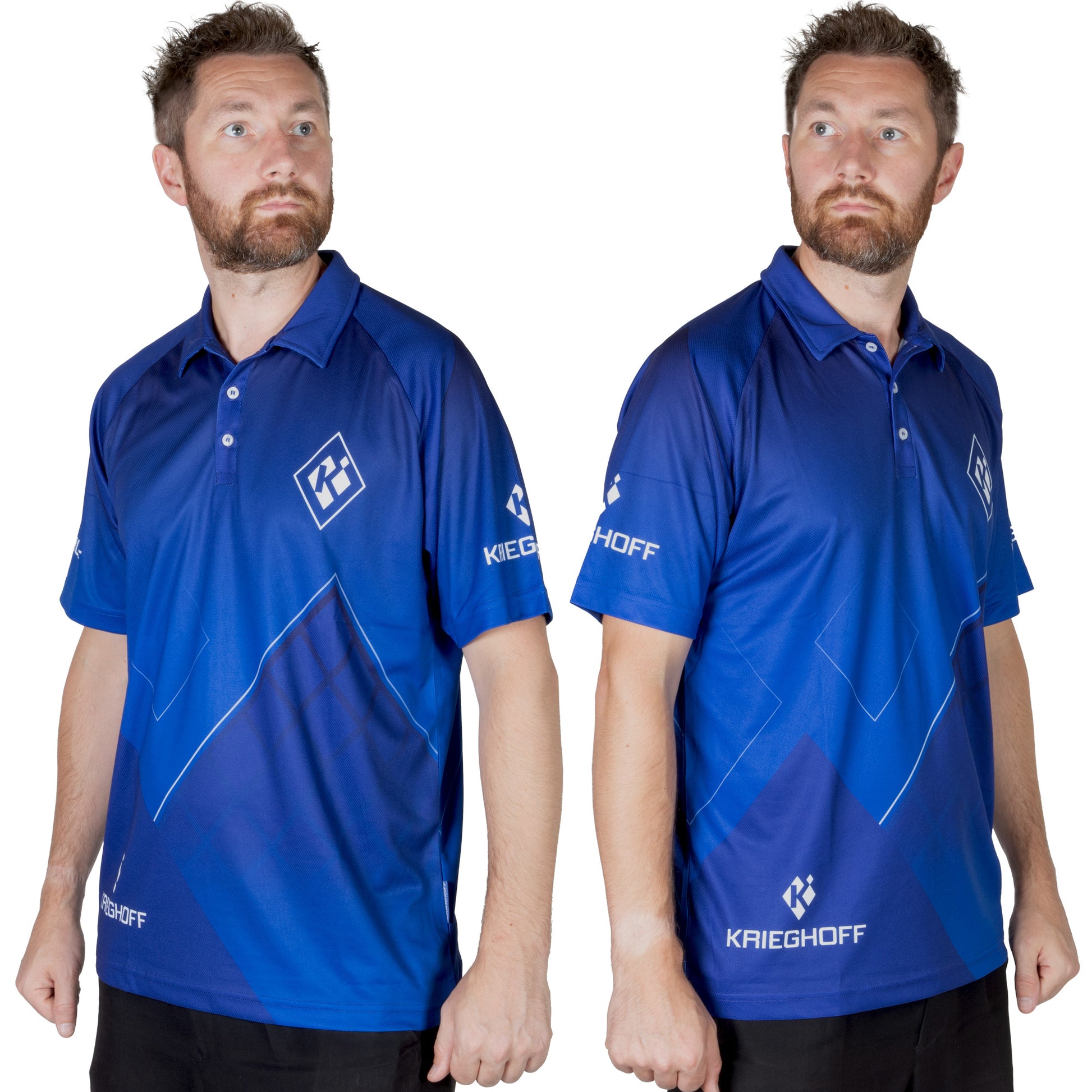 This is a polo-shirt designed specifically for Krieghoff. The royal and navy colours incorporate subtle diamond patterns throughout, with dark to light blue tones graduating from top to bottom. On the front in bold white contrasting colours, the Krieghoff Diamond logo on the left chest and the full Krieghoff Logo on the lower right. Featuring full Krieghoff Logos on the right and left sleeves and also across the shoulders on the back. Krieghoff also features on the rear of the collar and on the stitched side tag.