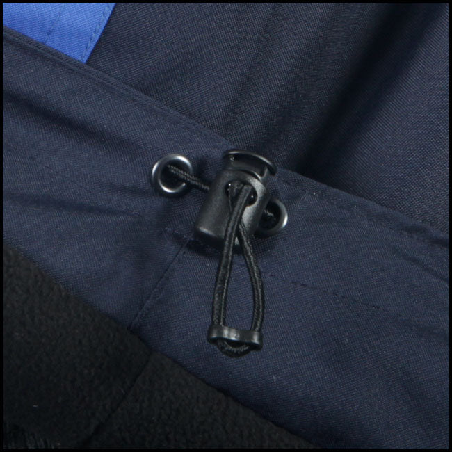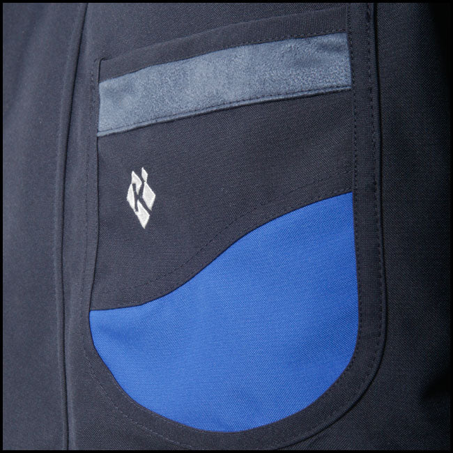 Colours: Navy and Royal Waterproof Fabric with Blue Faux Suede Detail. White Embroidery. Black Fleece and Black Quilted Lining.